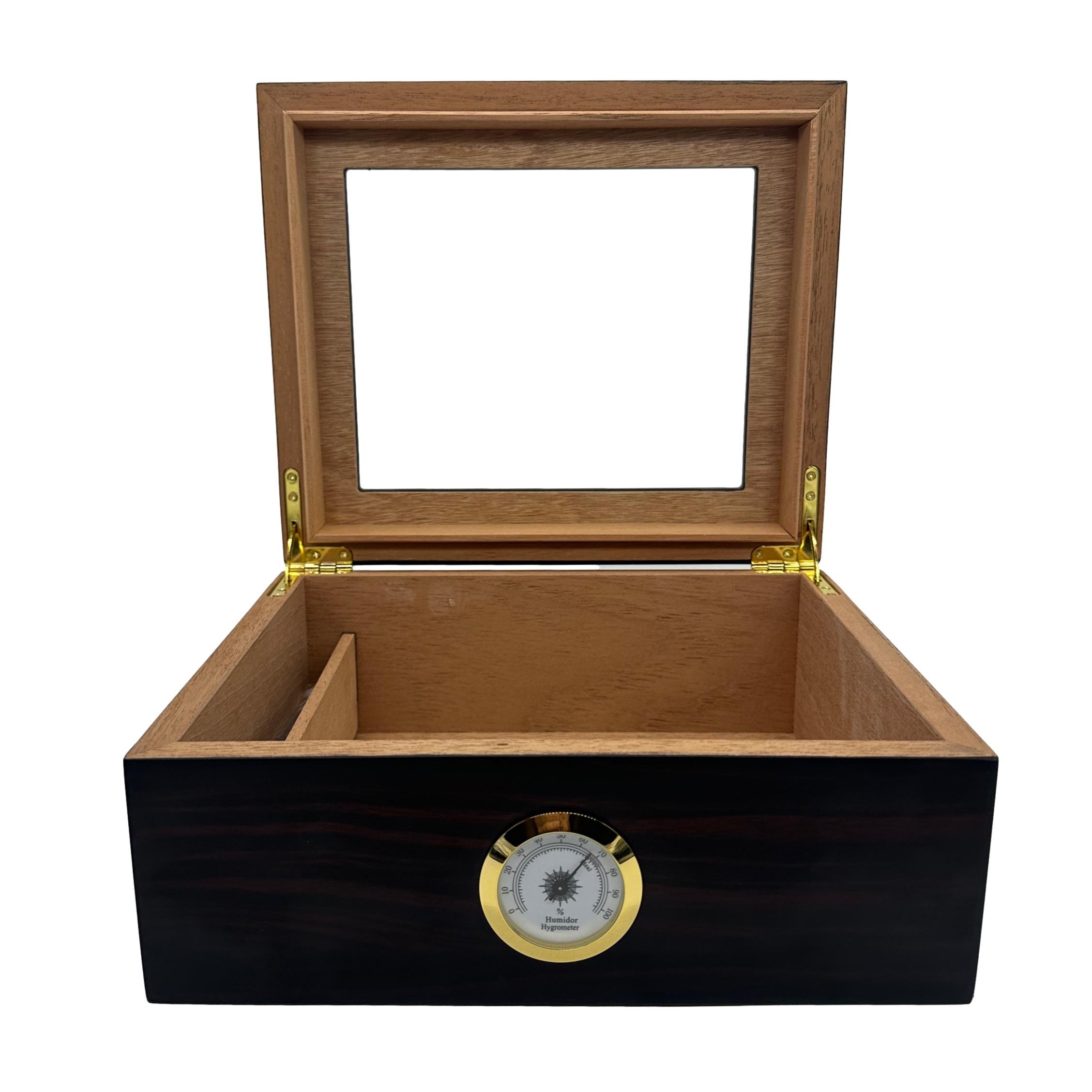 "Espresso" Wood Cigar Humidor with Spanish Cedar Lining and Glass Lid. This 50 cigar humidor is finished in a gorgeous ebony wood, lined in spanish cedar, and finished with a glass viewing top. The external hygrometer ensures your cigars are always kept in optimal humidity. All this makes our Davey humidor the perfect addition to any office, home and especially man-cave.