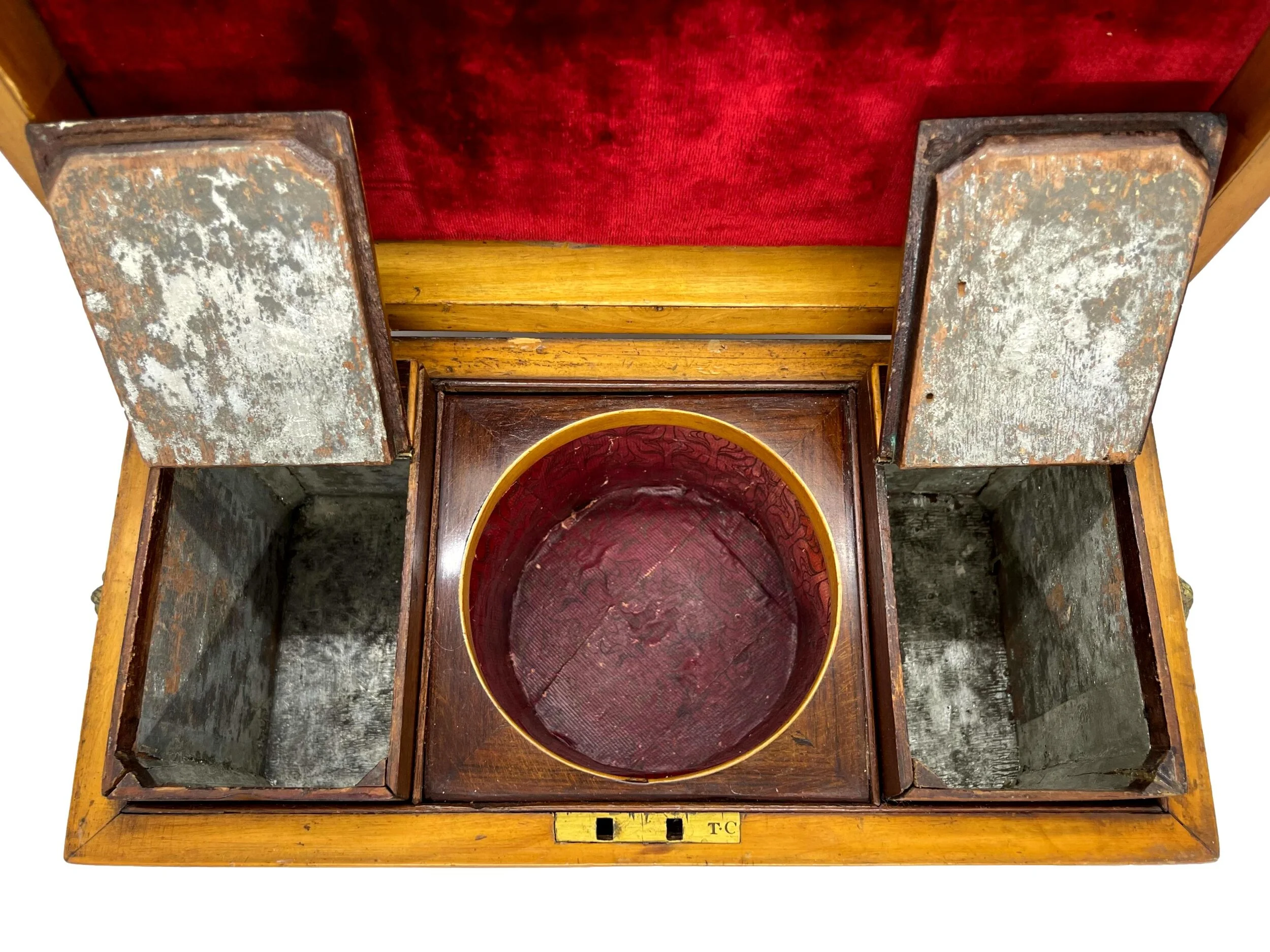 William IV rosewood and satinwood-banded tea caddy, English, ca. 1835, of sarcophagus shape, with lion mask ring pulls to either side, the fitted interior with two lidded tea compartments and space for the mixing bowl (not present), on molded brass repousse foliate feet.