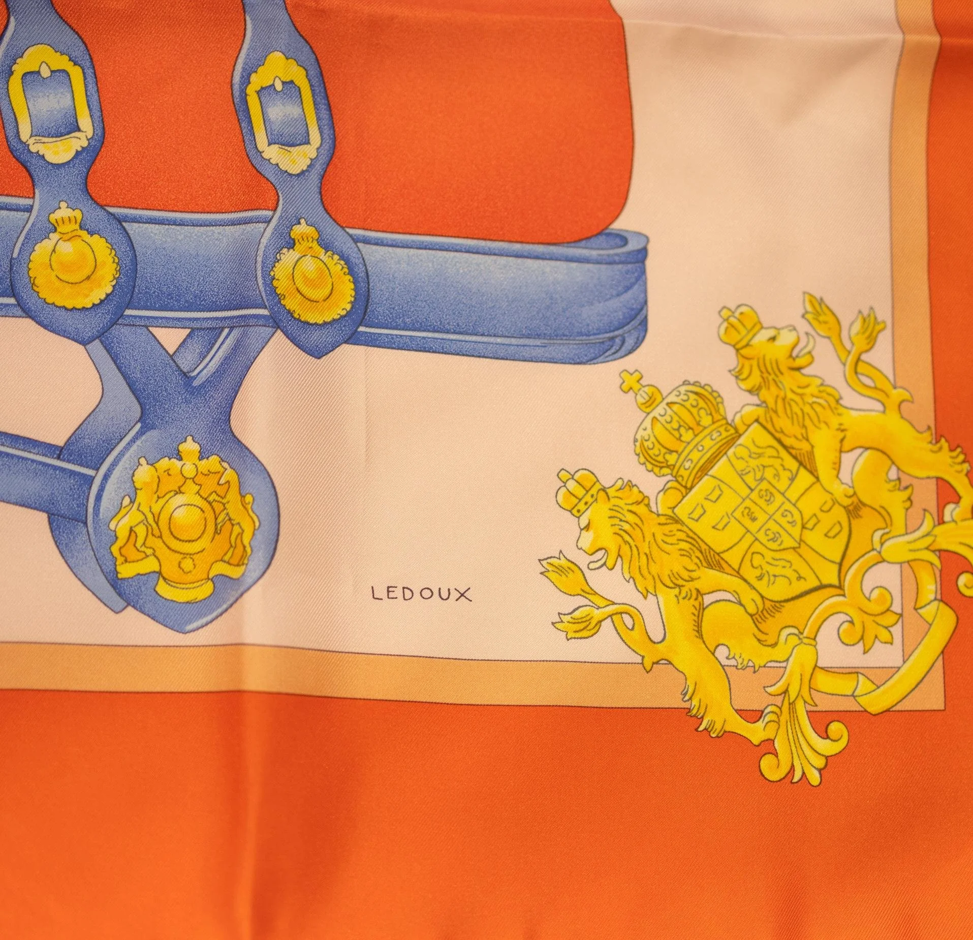 Hermès "Harnais de Cour" 90cm Orange Silk Scarf by Philippe Ledoux, 2021. This incredibly rare and highly sought after design "Court Harness" or French for was originally designed in 1977. Handcrafted in France to the highest luxury standards, Hermès scarves are true wearable pieces of art that take 18 months to create from start to finish with over 750 artisan hours into each scarf design. The scarf design and color-way was made by one of Hermès most prolific designers, Philippe Ledoux who was responsible for many designs such as "Springs" and "Napoleon". This particular scarf is a 2021 re-issue and comes in the beautiful signature Hermès orange and pale pink color-way that depicts scenes from the traditional French court garb for horses. Scarf is in great like new condition with plump hand rolled edges. Full condition report and specifications listed below: