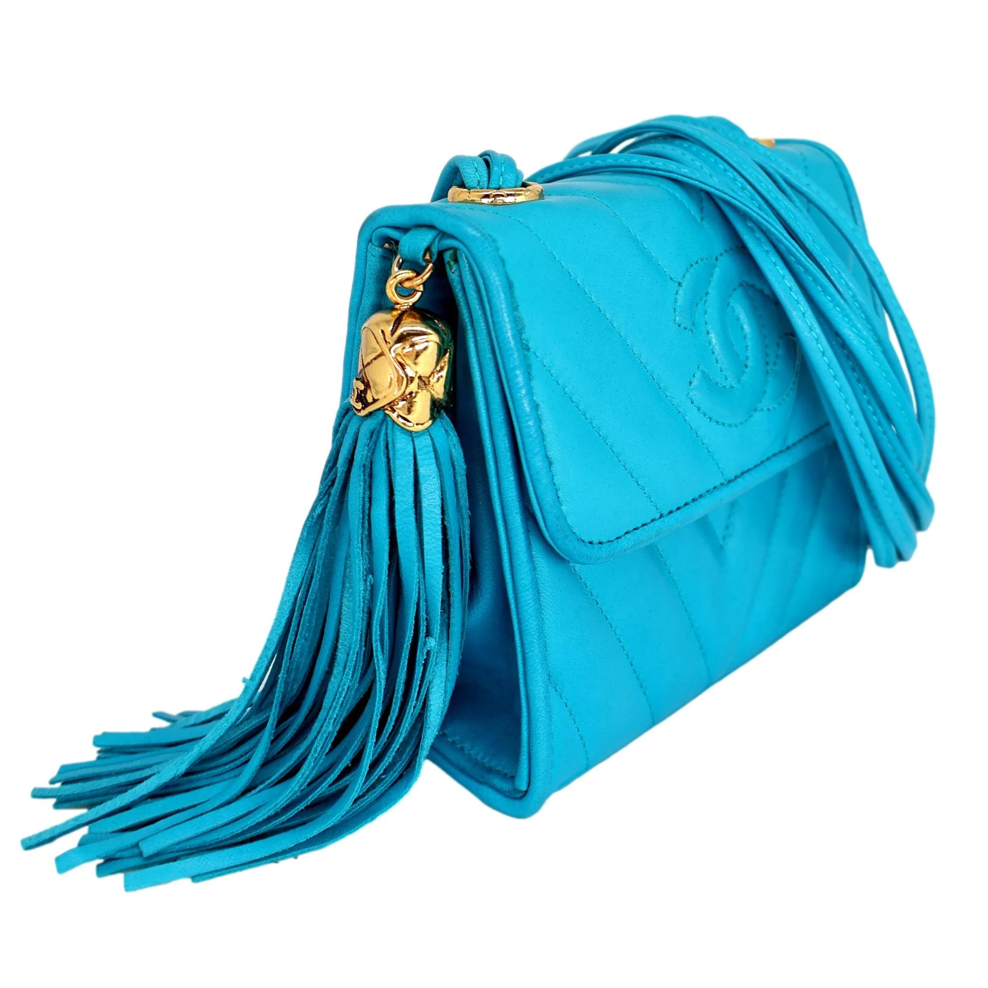 Chanel Turquoise Lambskin Mini Tassel Chevron Quilted Crossbody Bag with 24KT Hardware, 1989. This extremely rare and highly sought after piece of Chanel history was one of the very first mini versions of this single flap bag produced, baring a serial code of "1999656" for 1989 - 1991. Handcrafted in Italy to the highest luxury standards, this camera bag is constructed from beautiful supple lambskin with matching interior. Iconic tassel lambskin fringe accessory and four stranded woven crossbody strap is adorned with 24-karat hardware that was used in Chanel's production before 2003. Single flap closure with one with magnetic snap closure is accented by a hand-stitched "CC" logo located to front side of bag amongst a chevron quilting. Interior opens to a single compartment approximately 4.5" in size with small zipped pocket with "Made in Italy" and "Chanel" gold foiled heat stamp above interior pocket. Don't miss this rare opportunity to add this incredible piece to your collection. In great gently used vintage condition with small press marks throughout and light marks to underside of of snap lock closure. Strap shows lights signs of use. Comes with certificate of authenticity, authenticity card, dust bag and original box.