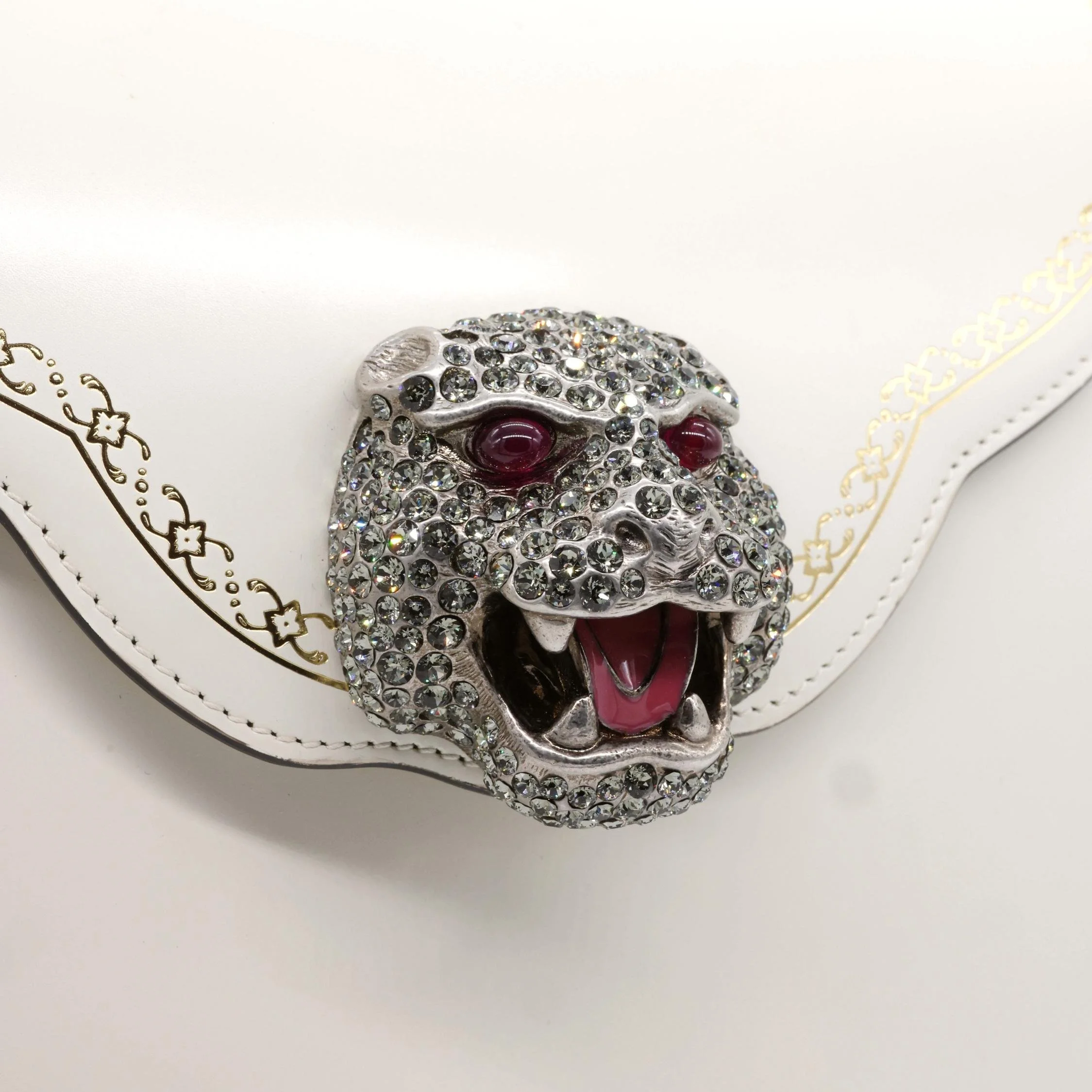 Gucci Thiara White Leather Bamboo Medium Top Handle Shoulder Bag, 2018. First introduced in the early 1940's, the Gucci bamboo bag came into production as materials around Europe became scarce. Bamboo, which could still be abundantly sourced from Japan, was used under the influence of heat by Gucci craftsmen in a way that would retain its shape once positioned to the bag. This incredibly rare and highly sought after edition of the bamboo top handle bag is assembled in Italy using 140 pieces by skilled Gucci craftsmen in a rich white calf leather with gold foiled accent framed border and detachable gold brushed chain strap. The tiger head centerpiece is hand detailed with Swarovski crystals and red glass eye accents that magnetically snaps upon closure with satin floral lined interior, two side compartments, two side slip and zip pockets to house all of your essentials. This bag is in excellent pre-owned condition with small signs of wear. Comes with Gucci dust bag and limited edition Jane Austen booklet with dust bag. Full specifications and condition listed below: Measures: 12” L x 8” H x 4.5” D - Strap Drop: