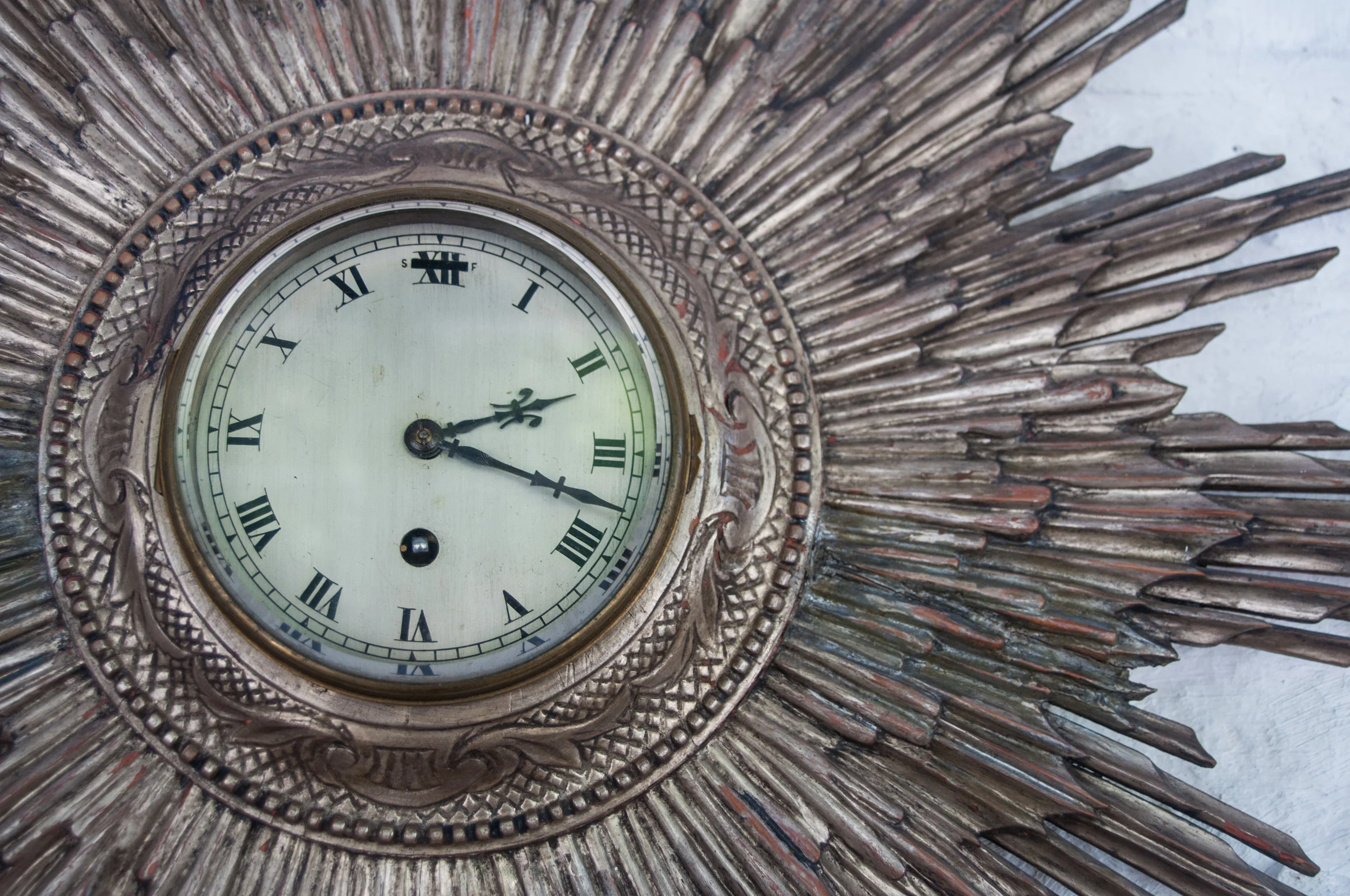 1920s Carved Wood Silver Leafed Sunburst Clock