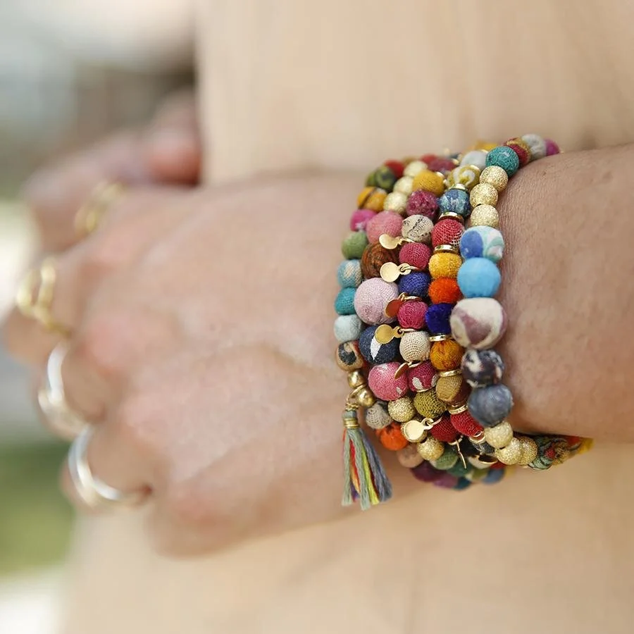 A strand of vibrant Kantha textile beads is finished with a multicolored thread tassel. Perfect for layering or wearing alone. Each strand is made from recycled Kantha textiles, so colors and patterns are all one-of-a-kind and will vary.