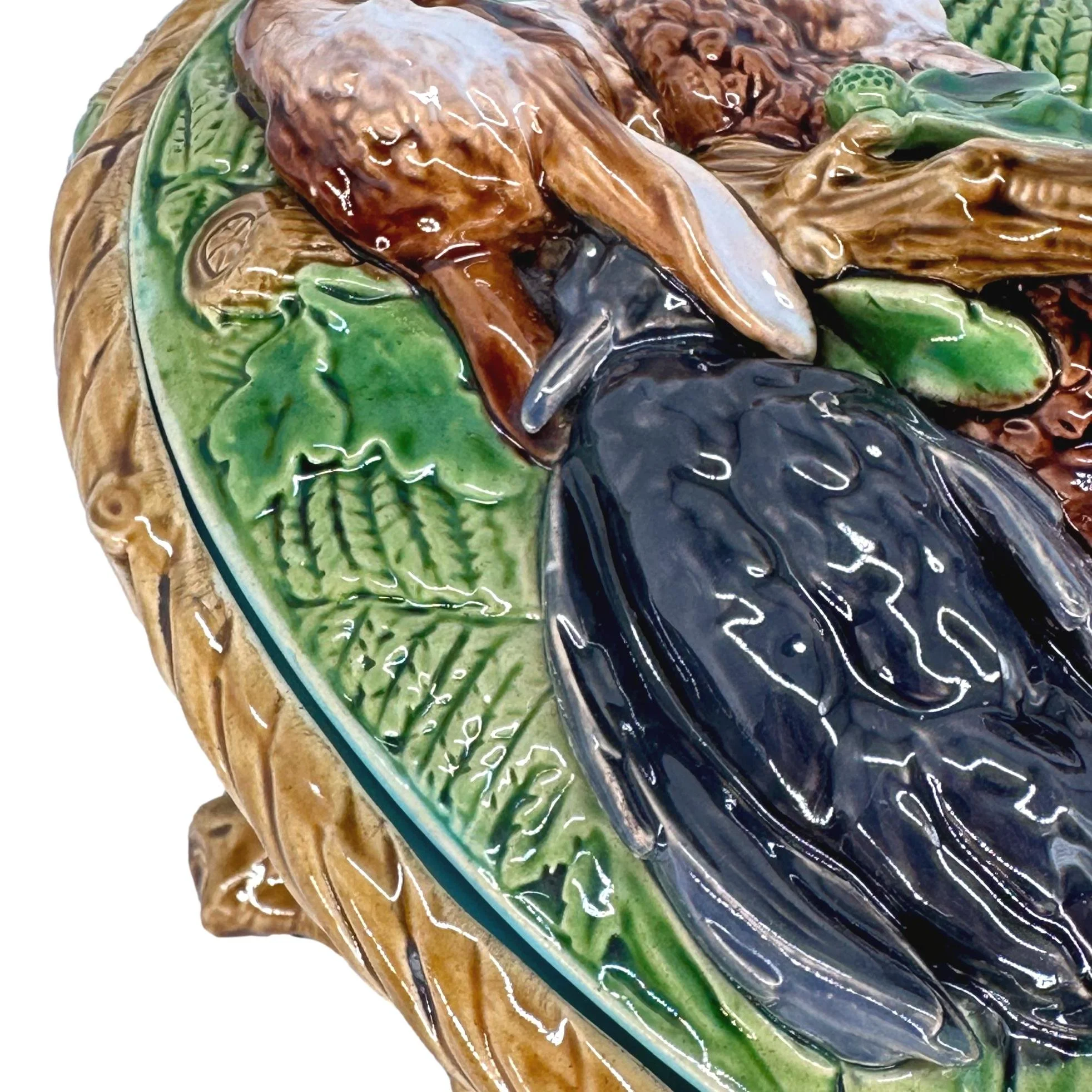 A Minton Majolica Game Pie Tureen, Cover, and Liner, the base molded as a wicker basket with green glazed oak leaves and banded branch handles on raised feet, the cover with high relief molded game: a rabbit, a Mallard duck, and other game bird on a bed of naturalistic leaves and ferns, the knop formed as a branch, the interior and base glazed in turquoise, with impressed 'MINTON' mark and date cipher for 1859, complete with the liner, which was used for actually baking the game pie and then served at table concealed in the tureen.