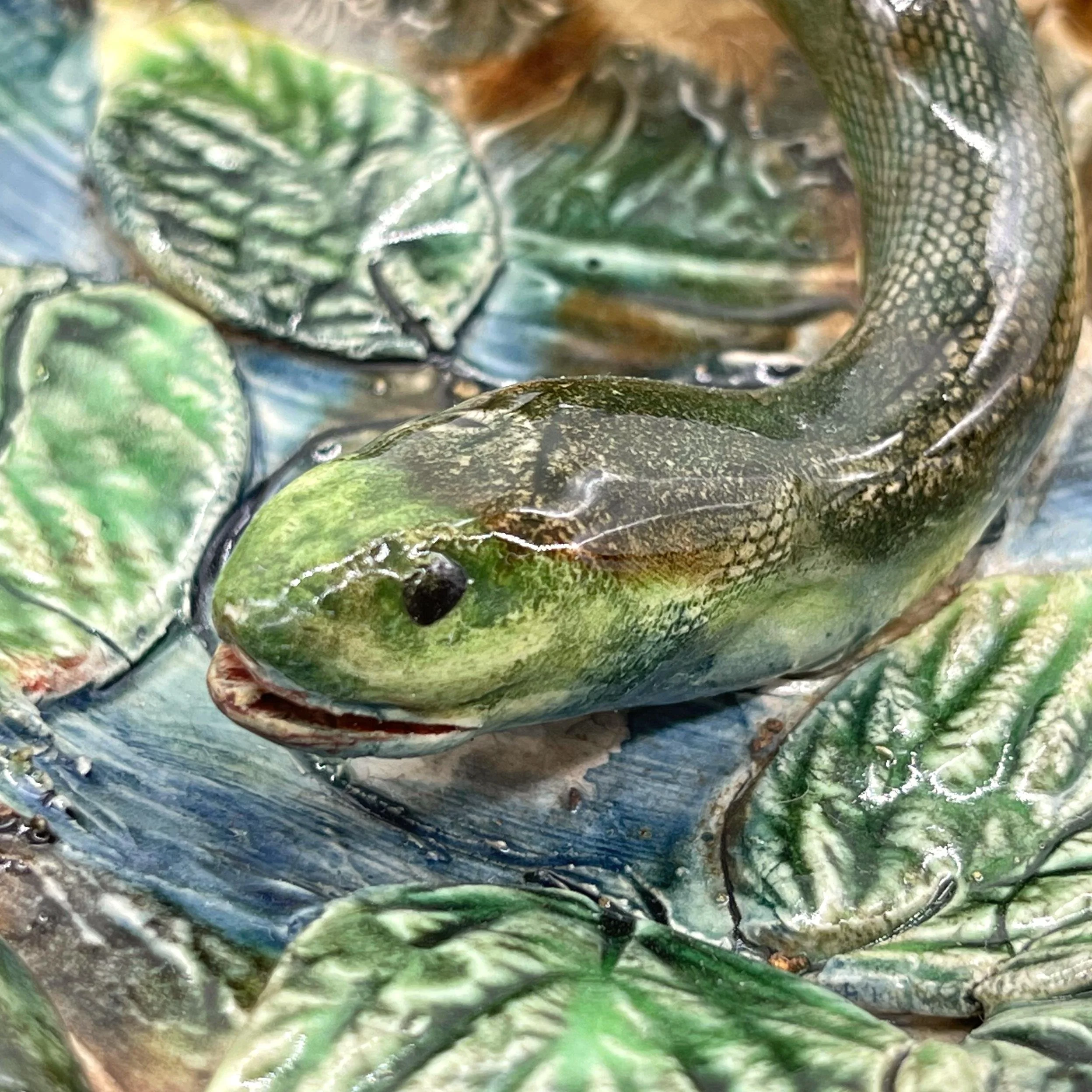 Longchamp Large Oval Palissy Ware Trompe L'oeil Platter, with molded and applied fish, two langoustines, and two naturalistically molded and glazed frogs, a green-glazed lizard, and a large snake to the center, with shells throughout, on green-glazed leaves and water, the reverse with impressed maker's mark, 'LONGCHAMP,' French, ca. 1875. For thirty years we have been among the preeminent specialist in fine antique majolica.