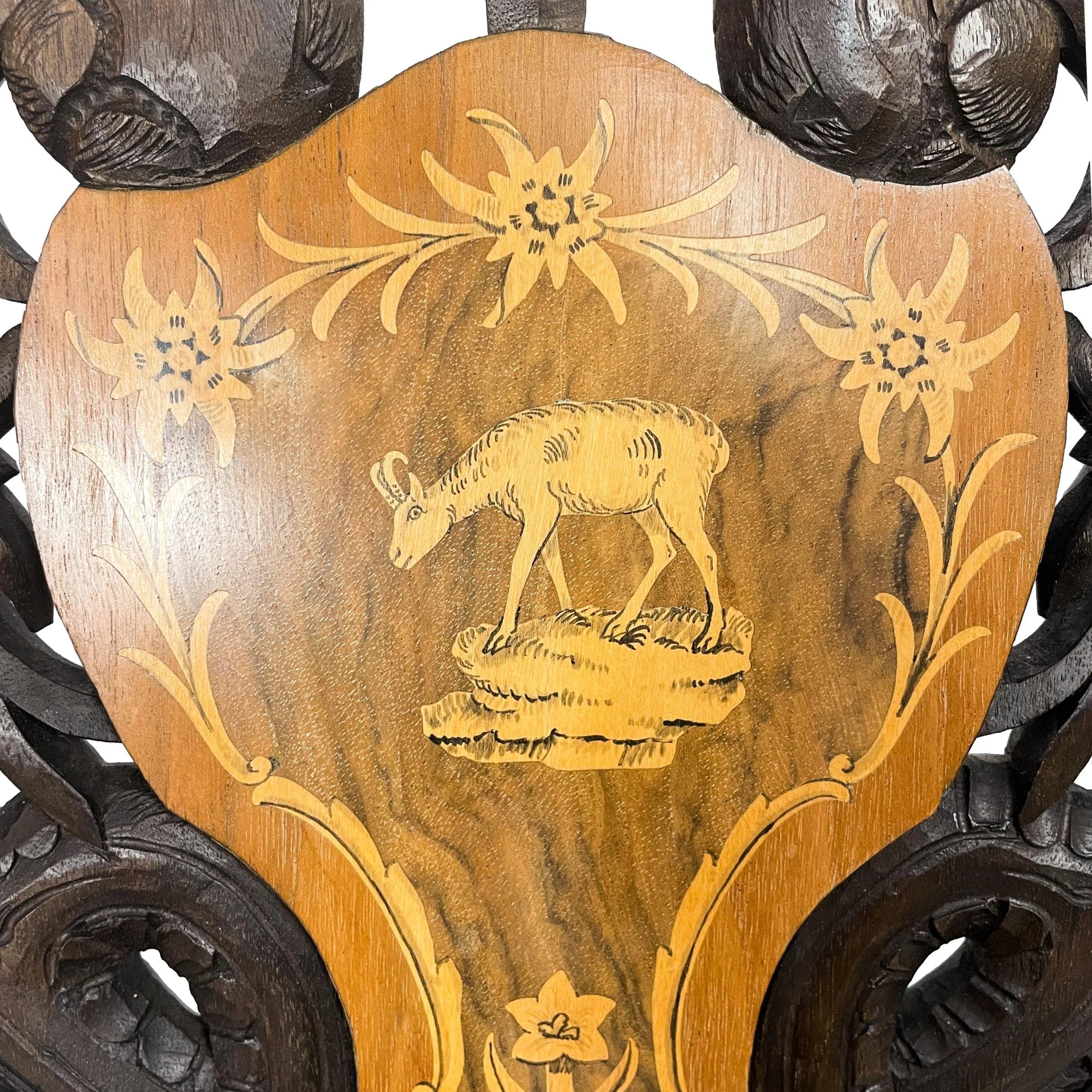 A black forest carved walnut chair, the seat and seatback with intricately inlaid cartouches each depicting an alpine chamois, with carved edelweiss and leaves, with the working music box mechanism under the seat, Brienz, Switzerland, ca. 1900. Arenski quotes Swiss Poet Heinrich Federer, who said in his memoirs, "Woodcarving brought riches to the village [of Brienz]. It became all the fashion and no Englishman left the Bernese Highlands without having seen the Giessbach, having eaten a fat roasted eel and having bought a Brienz woodcarving." Arenski goes on to say, "Thus, as the tourist industry flourished and thrived, so did the carvers, selling their wares to the well-heeled visitors."