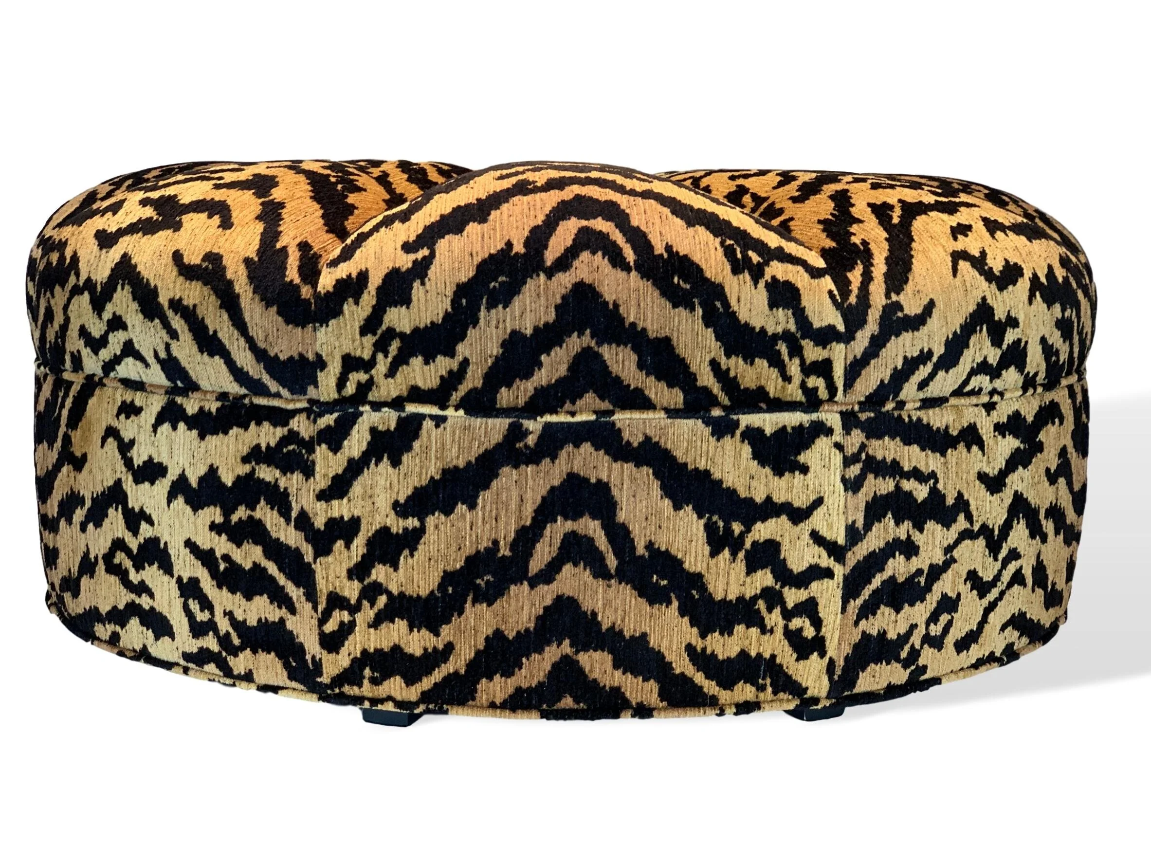 Large 41-inch circular ottoman in Italian designer ultra high-end silky tiger skin woven heavy cut and uncut chenille; the hand of the fabric is unexpectedly soft and luxurious. Ottoman was recently handcrafted and upholstered from new materials and new fabric by the best craftsmen and artisans in Morganton, NC, the center of high quality, exclusive furniture making in the Nation. Built to the highest standards possible, it is constructed of wood, and is eight-way, hand-tied, button-tufted and the upholstery is flow matched beautifully, adding to its whimsy and charms. Simply put, it is the best ottoman, the best fabric, and the best upholstery.