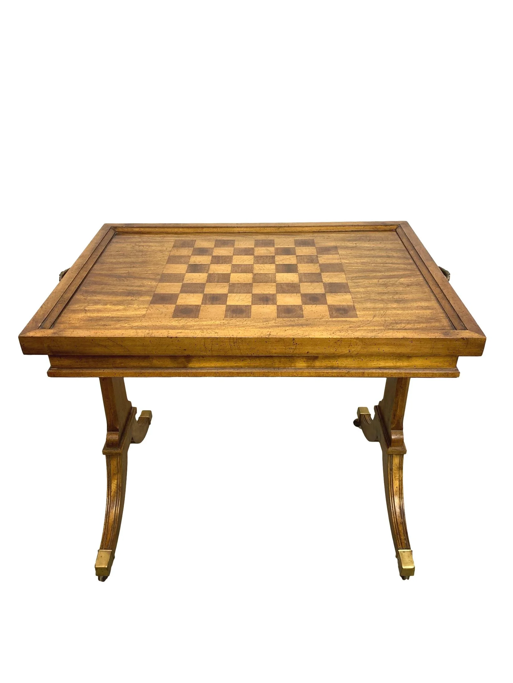 Regency style walnut convertible inlaid chess table/tea table with backgammon board interior, with highly figured walnut top, the reverse with a contrasting walnut inlaid chessboard, with a backgammon board underneath the removable top, with solid brass handles and a central brass support rail, the reeded legs terminating in brass toe caps and castors, English, ca. 1950.