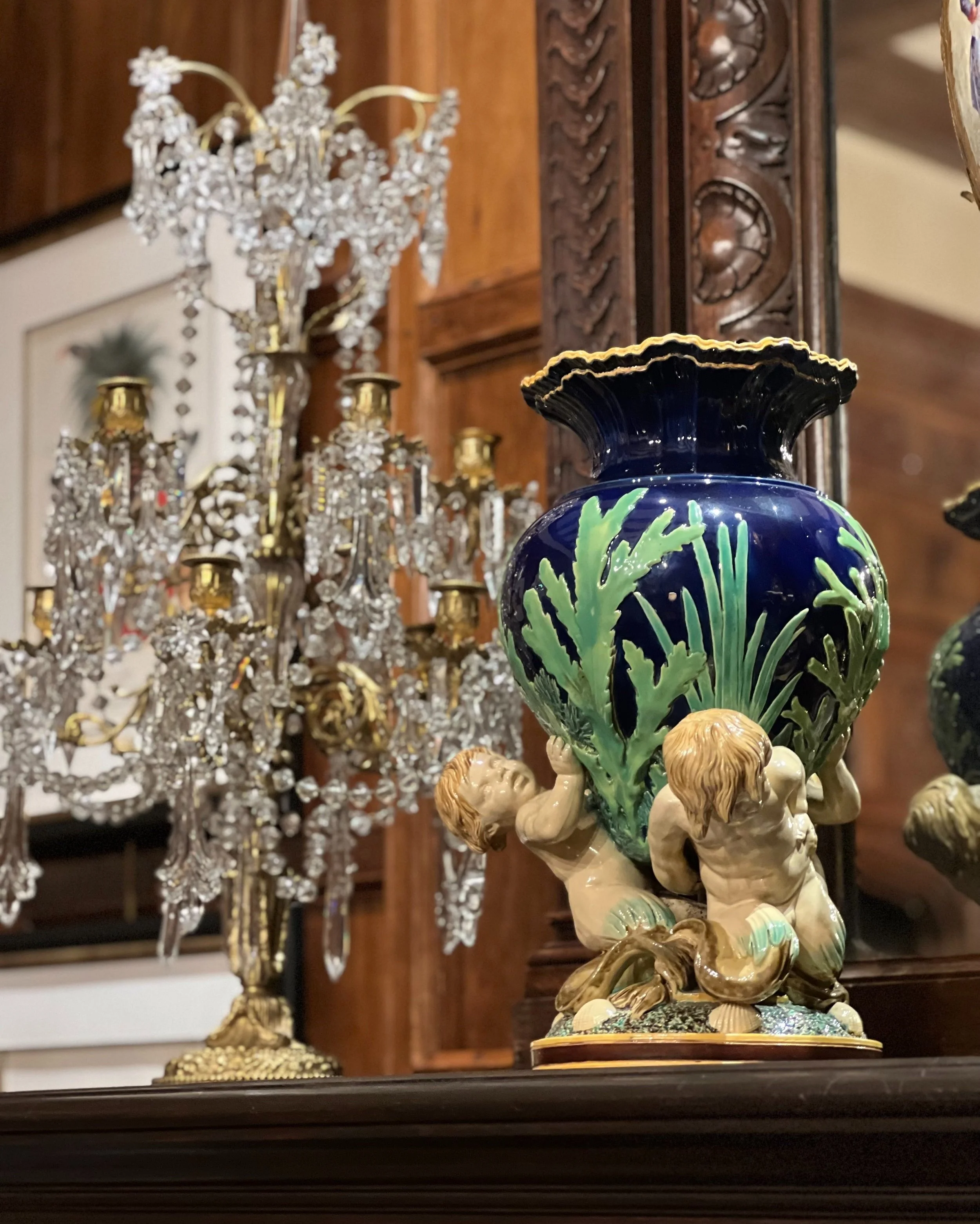 Minton Majolica 'Triton' vase featuring two figural cherubs supporting a cobalt blue vessel with raised seaweed decoration, displayed on a carved mantel beside a 19th-century gilt brass and crystal girandole candelabra at Gilded Age Antiques