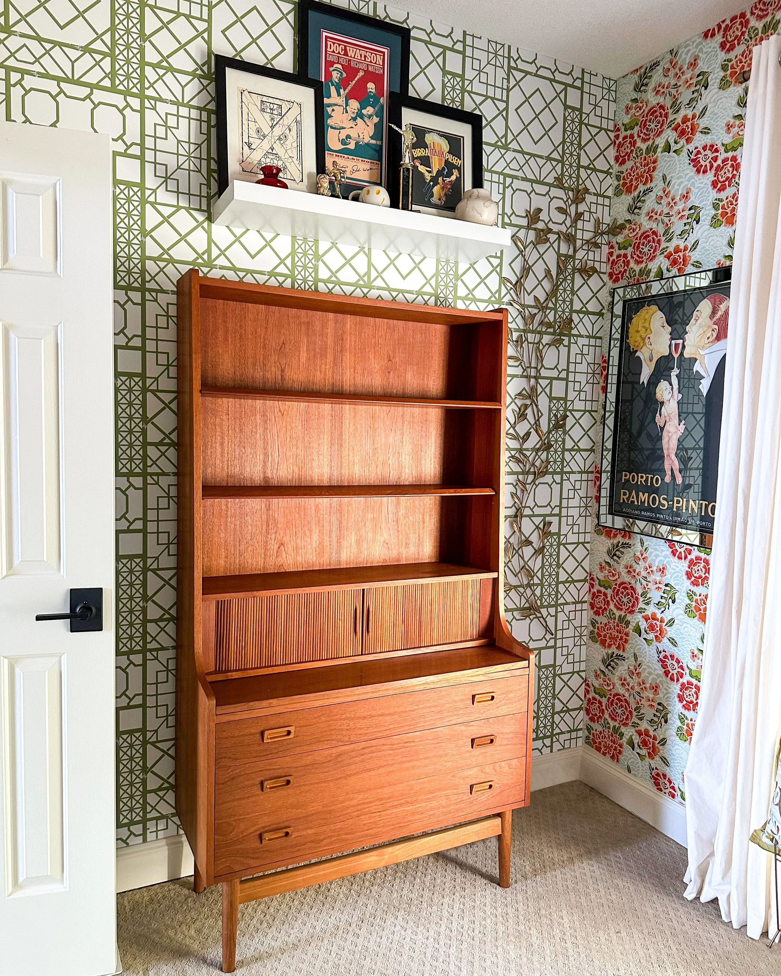 G-Plan Mid-Century Modern teak secretary cabinet with tambour doors, open shelving, and sculpted drawer pulls—shown in a patterned wallpapered room with framed vintage art. Available from Gilded Age Antiques, with additional G-Plan pieces in stock.